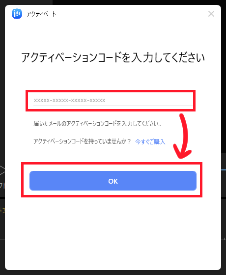 新しく出てきた画面にてライセンスコードを入力し、OKを押すと認証完了となります。