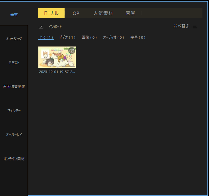 動画用の素材(動画・画像・音声)などを入れたり、使用する素材を選ぶ部分です。