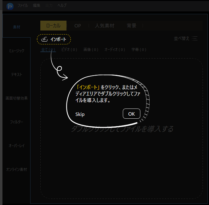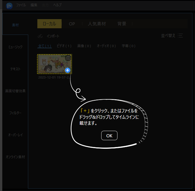 新規に動画・画像をドラッグ&ドロップで追加することで素材が使用できます。
