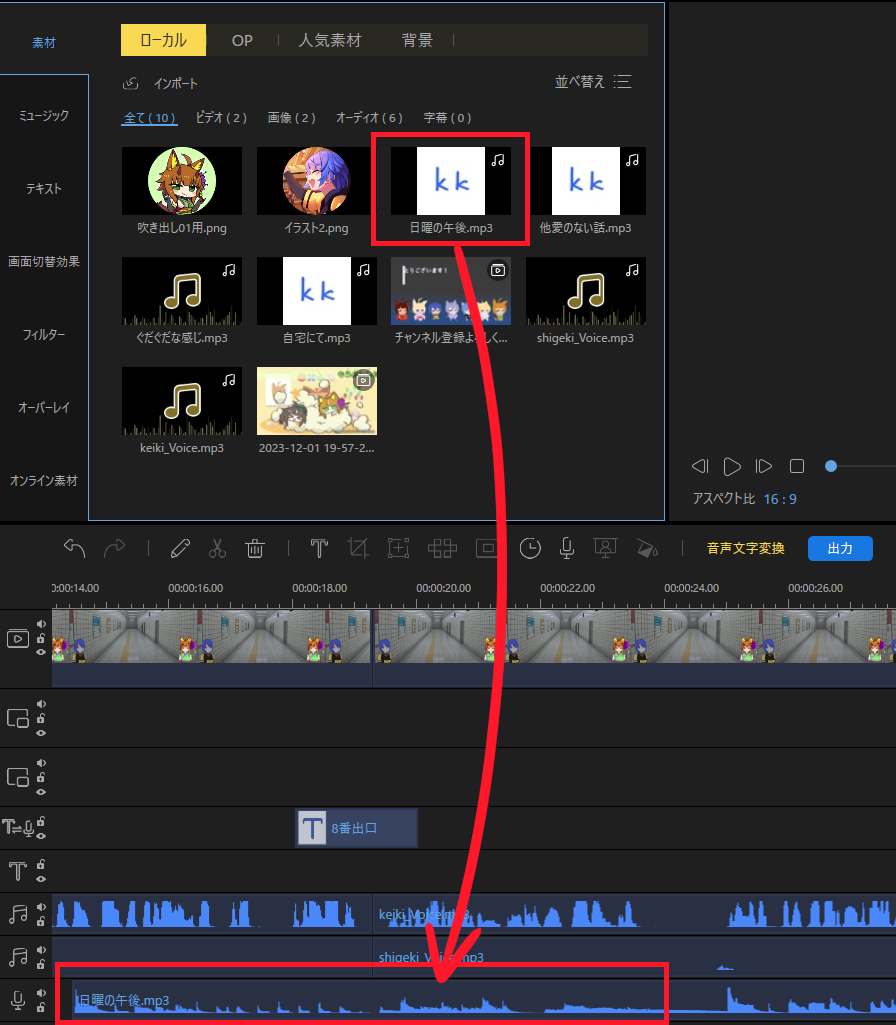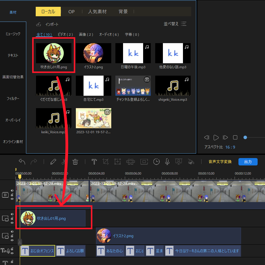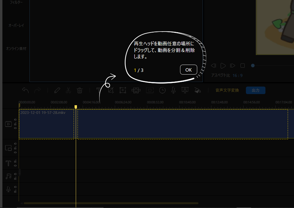 タイムライン上では動画の指定した部分にテキストやエフェクトを追加したりして使用します。