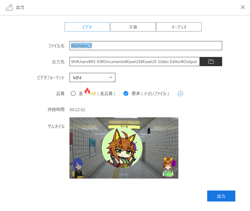 プロジェクト中央の”出力”を押すと出力設定ウィンドウが表示されるので、そちらでファイル名・出力先・フォーマット等を設定し動画を書き出すことができます。