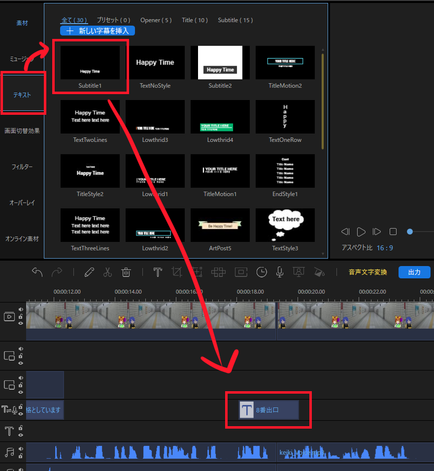 文字入力をするためにテキストタブから好きな文字をタイムラインに追加し文字入力をしました。