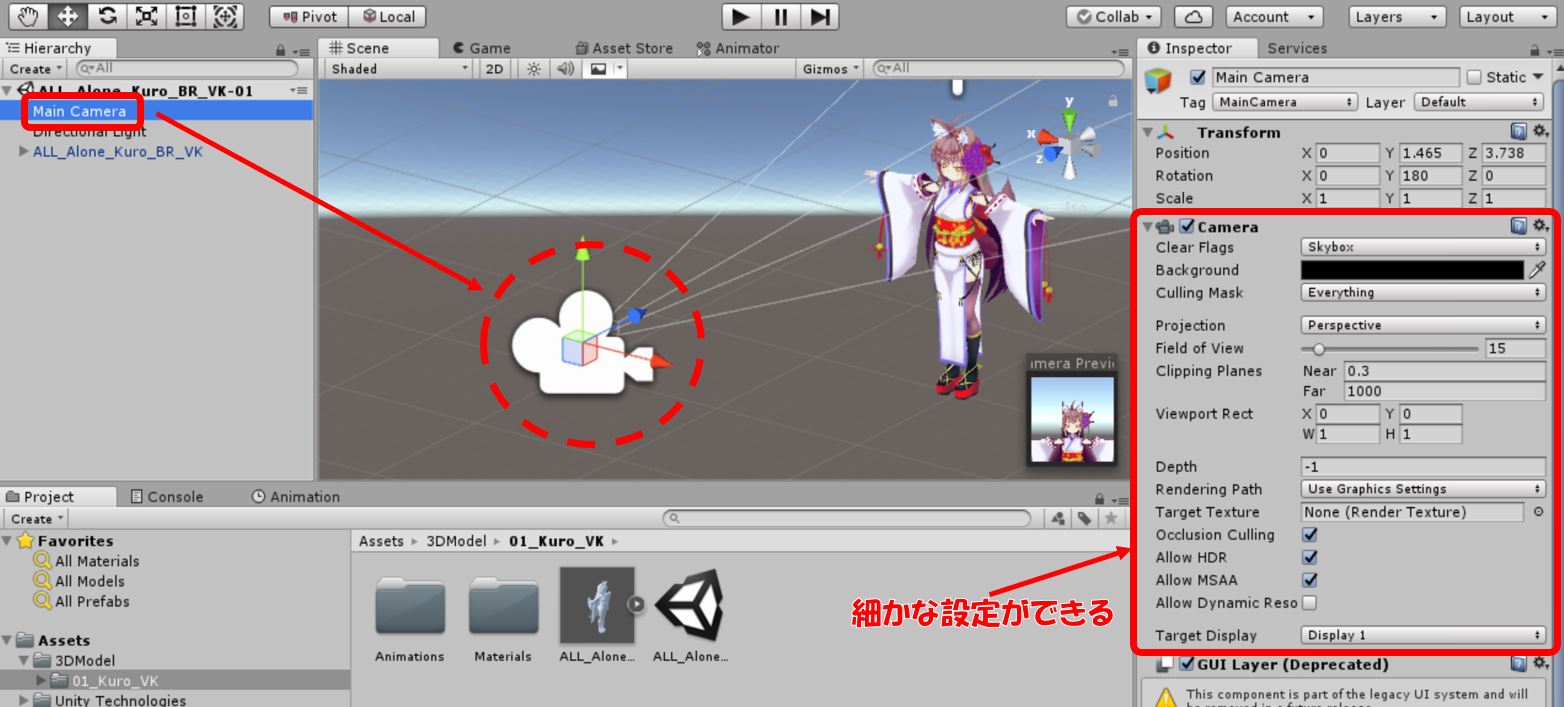 Unity内HierarchyにあるMain Cameraを使い画角や背景色などの設定をしていきます。