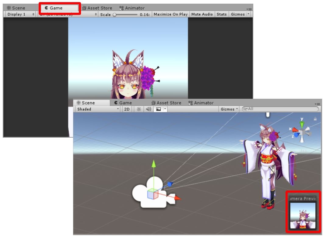 また移動したカメラが映している情報は同じScene内右下に出ている”Image Preview”かGameタブで見ることができます。