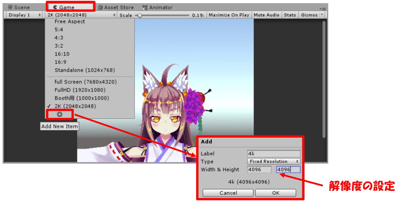 上記で作成したアスペクトラベルがGameタブ上で選ばれていれば解像度の設定は終了になります。