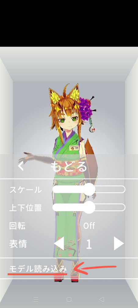 アプリを起動したら画面をタップして出てくるメニューから”モデル”→”モデル読み込み”を押します。