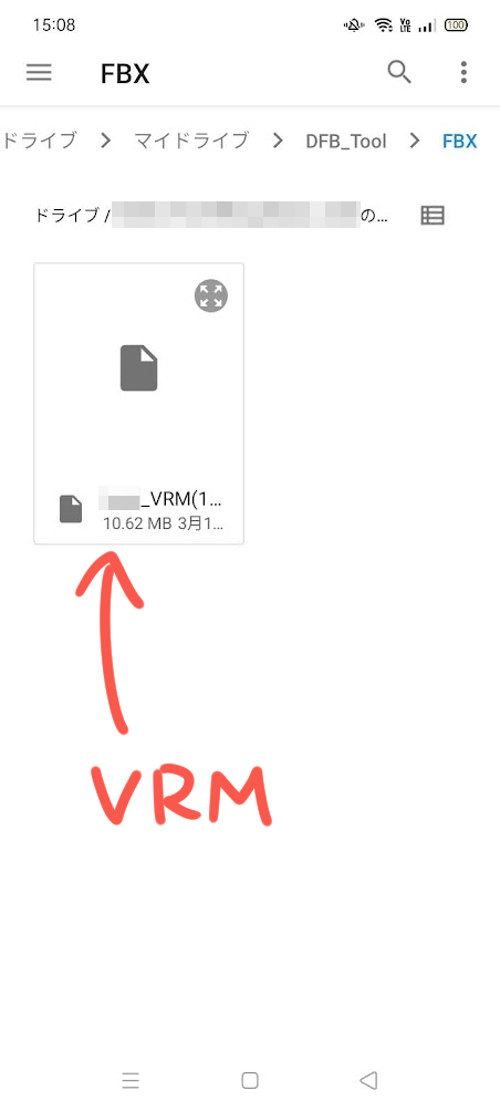 スマホ端末内やGoogleドライブに入っているVRMファイルを選択し、読み込ませる。