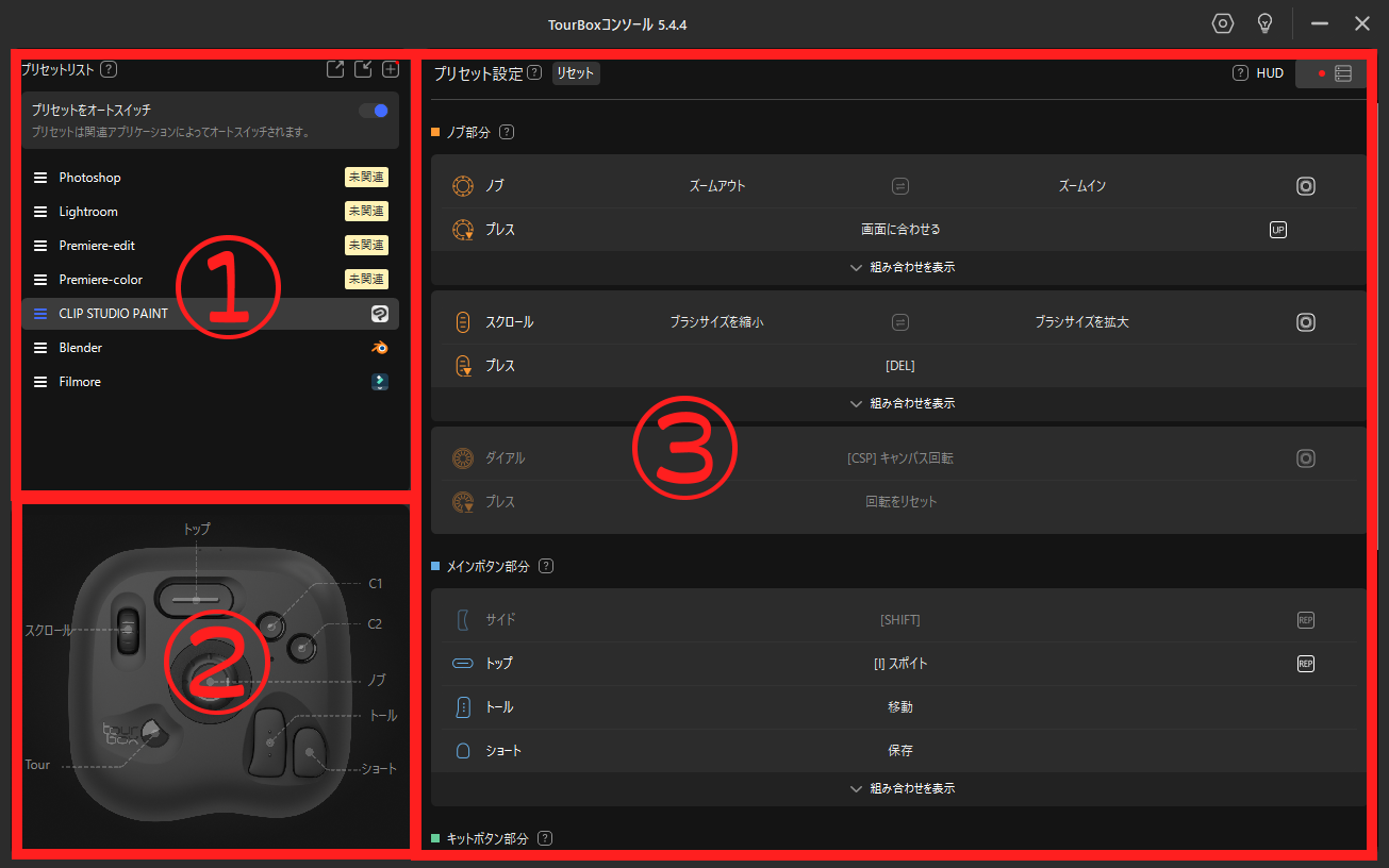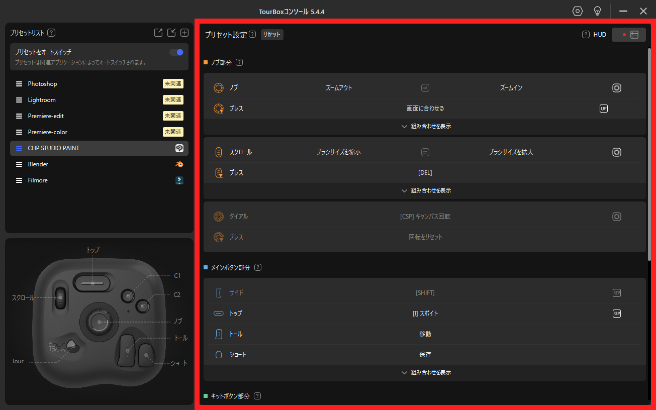 使用ソフトは前回と変わらず「TourBox Console」で、プリセット機能、ツールにより自動切換え機能など便利なものとなっております。