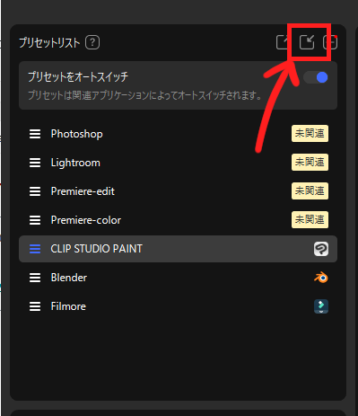 プリセットのインポート・エクスポートやオートスイッチなどが行えます。