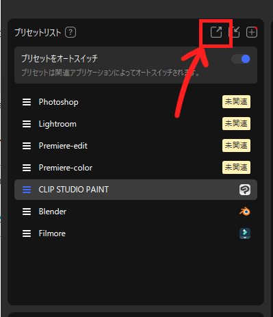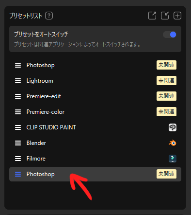 標準でいくつかのプリセットが入っていますが、TourBox公式HPからプリセットをダウンロードしてきてインポートすることができます。