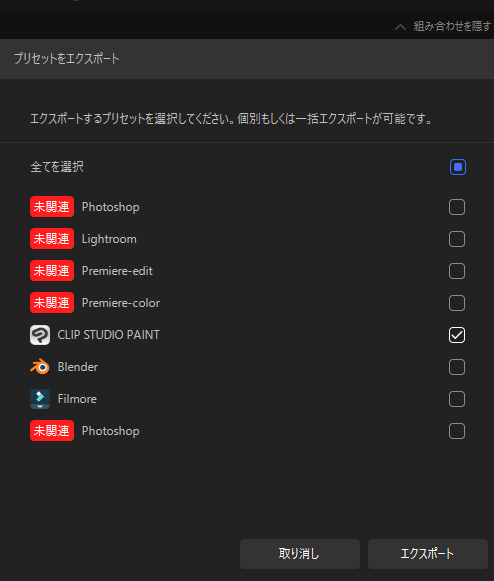 エクスポート画面が出てくるので、エクスポートしたいプリセットにチェックを入れて”エクスポート”を押すことで完了します。