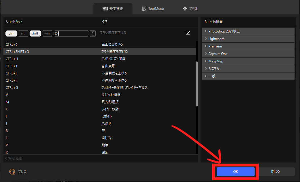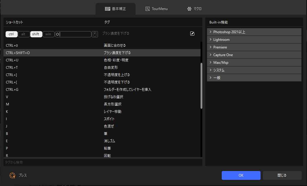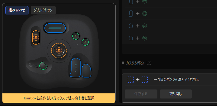 と思って使っていたのですが、こちらはTourBox Console側(Ver5.3.0以降)にて任意の機能を組み合わせで設定できるようになっています。