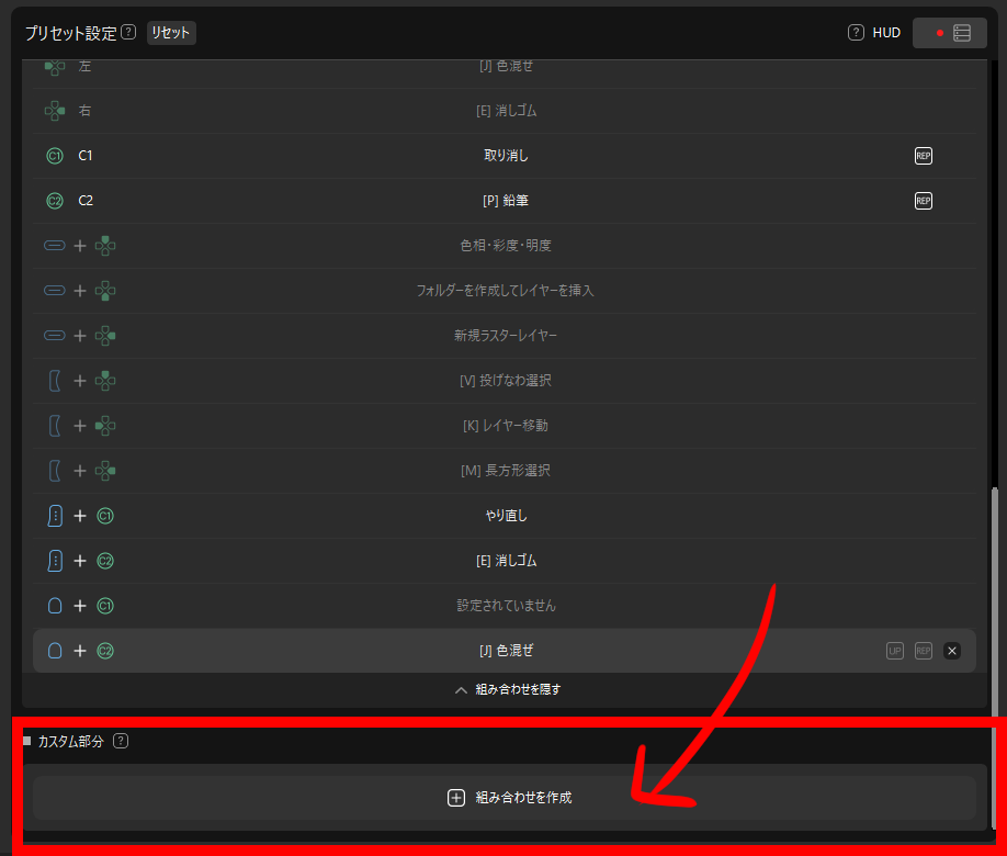 プリセットを編集する場合はTourBox Console内”プリセット設定”の設定したいボタンをクリックして操作をしていきます。