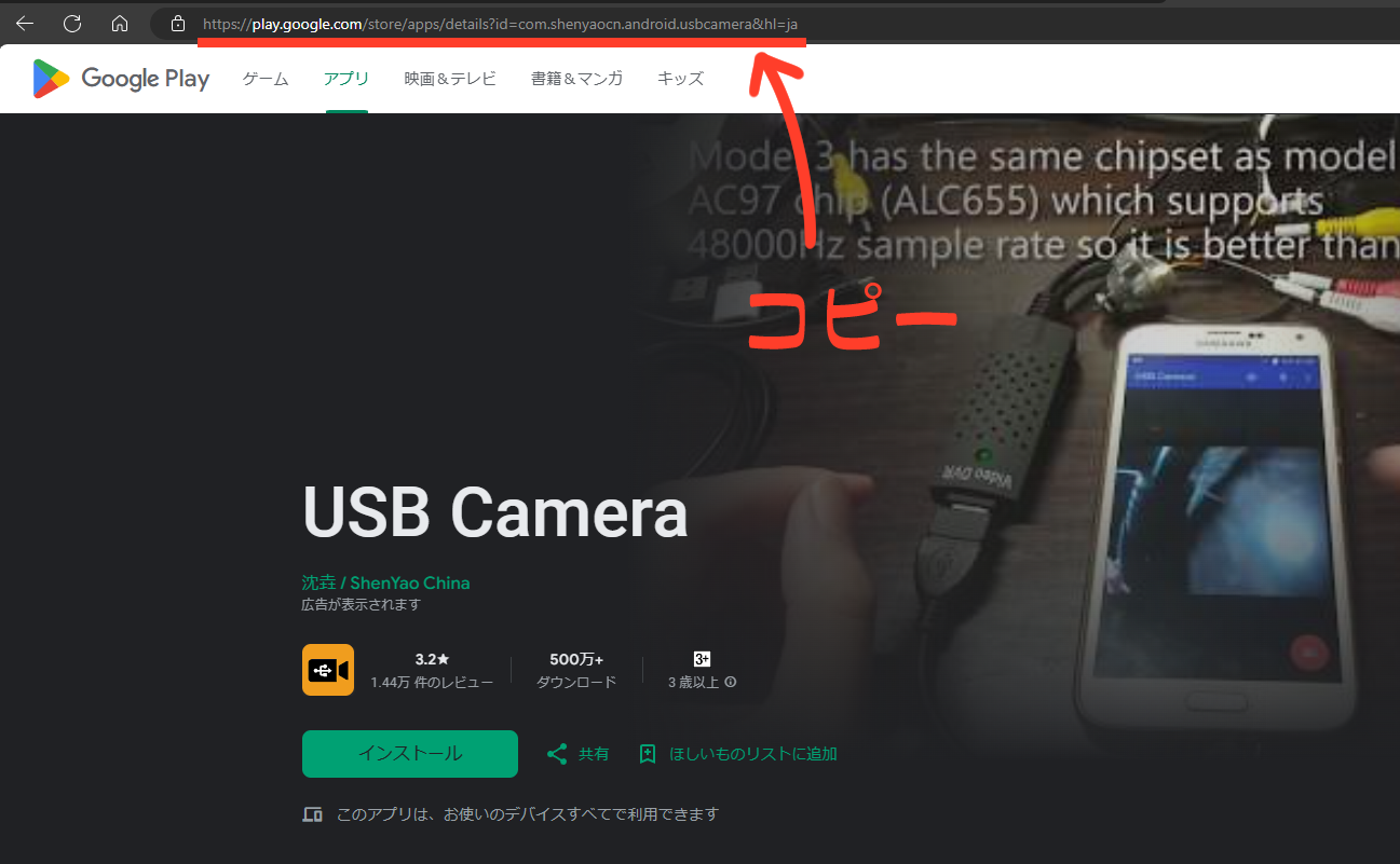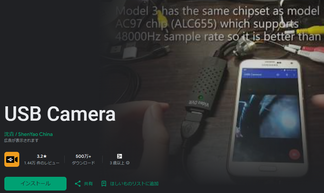 最初にGoogle Playの”USB camera”のページに行きます。