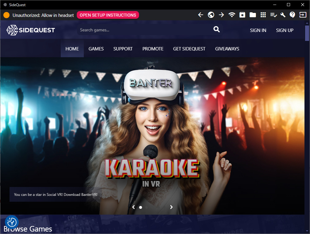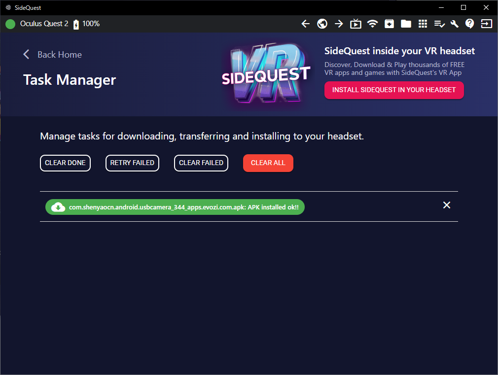 インストールすると以下の”SideQuest”が開きます。