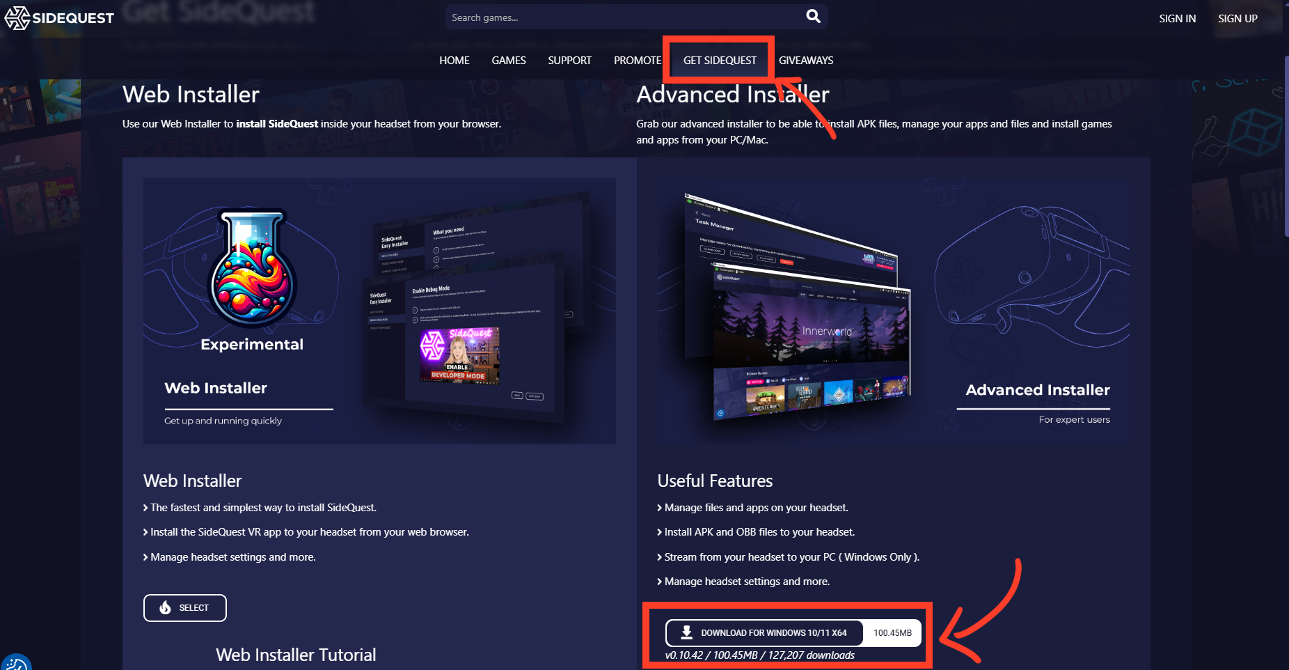 サイト上のメニューバーから”GET SIDEQUEST”をクリックし、Advanced Installerの下にあるボタンを押しましょう。