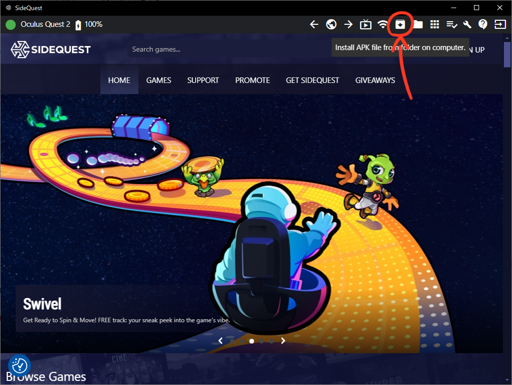 この状態でSideQuest内右上の”Install APK file ~”を押し先ほどダウンロードしたapkファイルを選択しましょう。