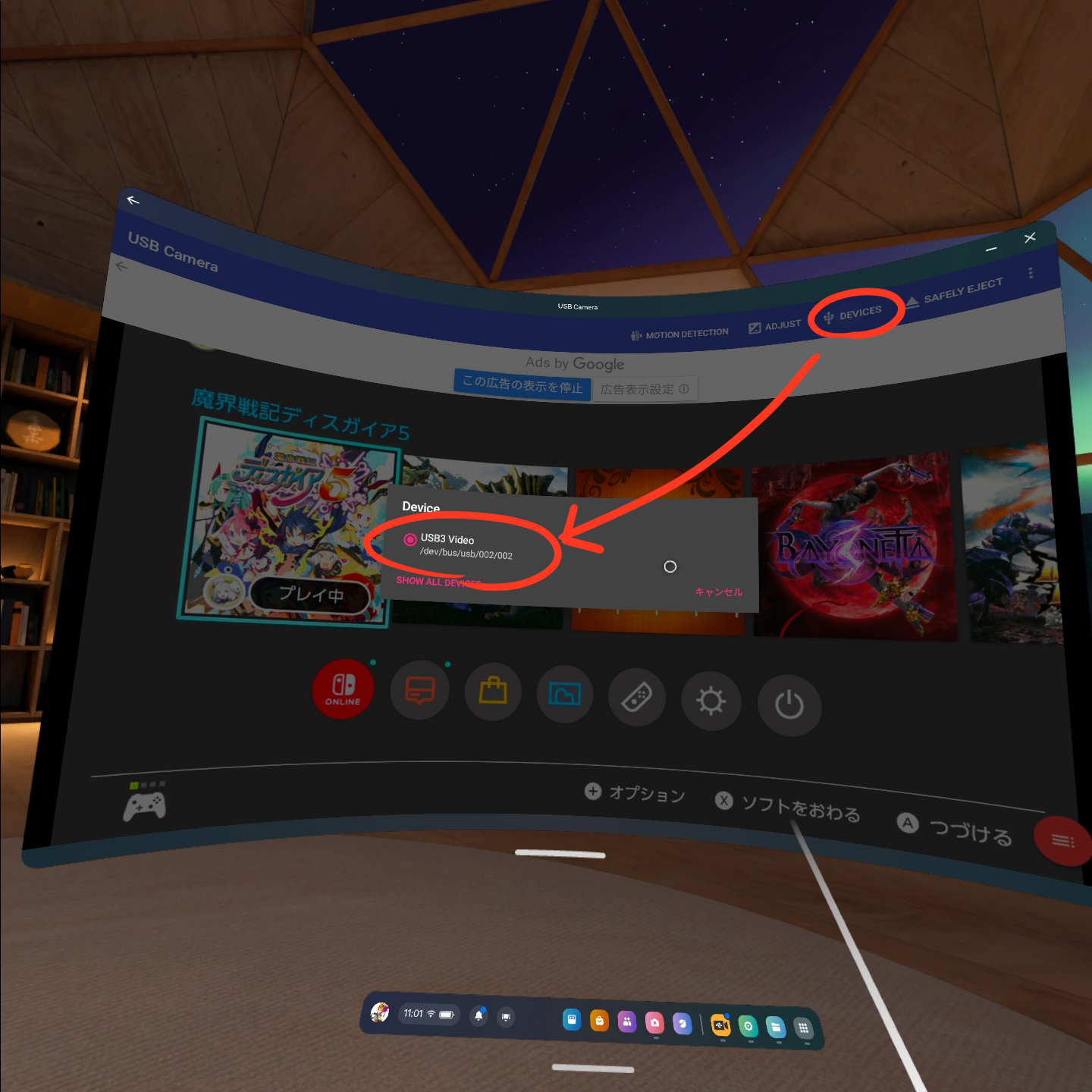 もし画面が暗転して表示されない場合は、コントローラのBボタンを押してUSBcameraアプリ内のメニューを表示し、”DEVICE”から接続しているキャプチャボードを選択しましょう。