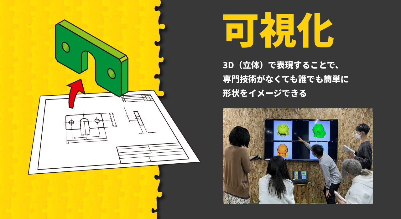 3Dデータファクトリー様では3Dデータを活かした活動として、立体表現をすることで現場での情報共有の円滑化を図るモデルの”可視化”や、現物しかないものを3Dスキャナーにて3Dデータに変換し設計図に落とし込むなどといった内容があります。