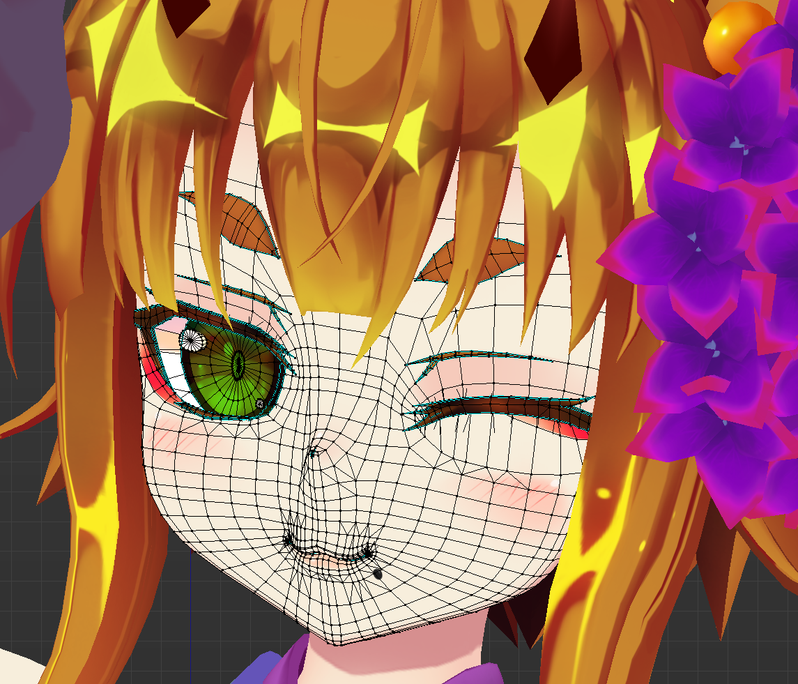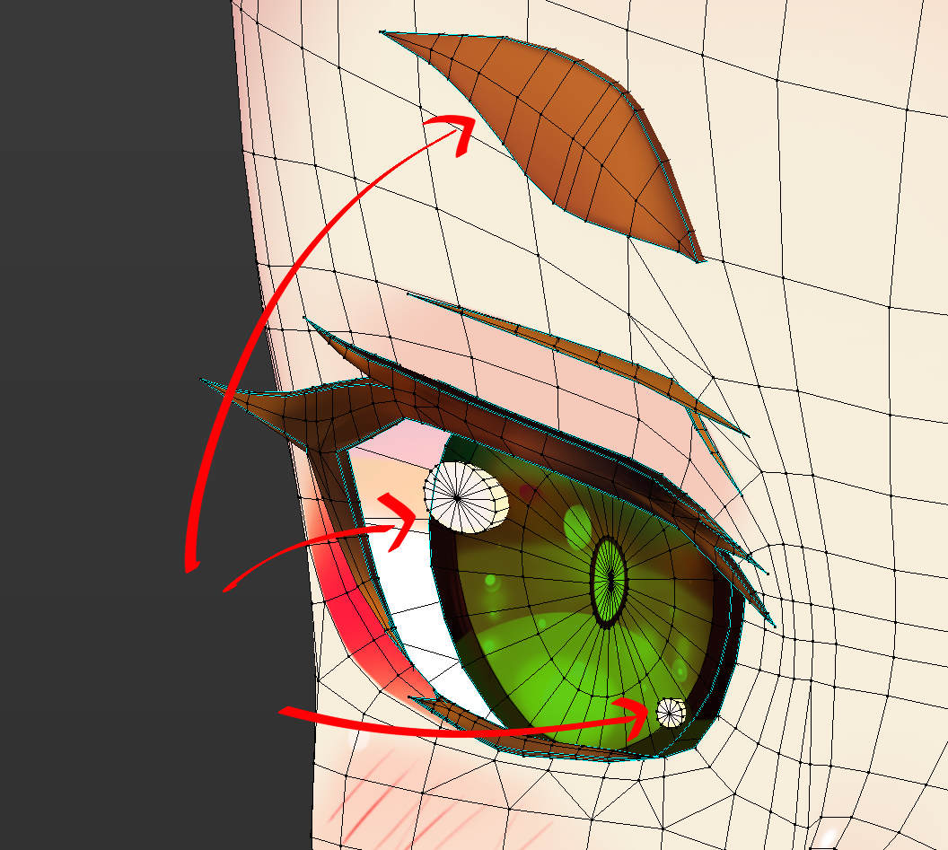 瞳やハイライトなどはモデルの都合上浮いている場合があるため厚み付けであったりポリゴン位置を調整することで浮かない形状にする必要があります。