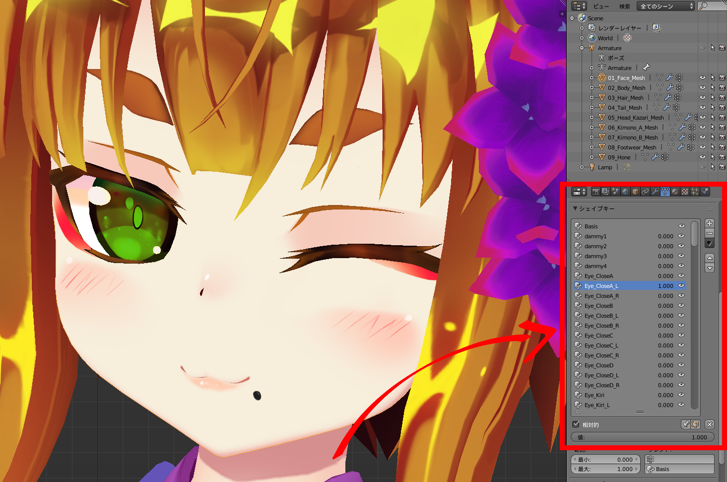 まずはBlenderのプロパティからデータタブの”シェイプキー”から変えたい表情のキーを0~1に変更して表情を作ります。