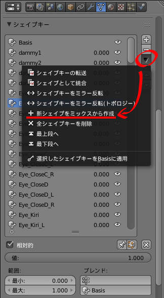 表情が決まったらシェイプキーの右側にある”▼”から”新シェイプをミックスから作成”をクリック。