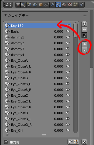 新しくできたシェイプキーを上下のマークを押し、”Basis”の上に配置させます。