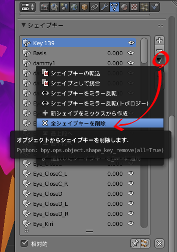 配置できたら”▼”から”全シェイプキーを削除”をクリック。
