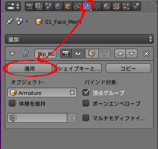 ポーズを固定するにはArmatureのモディファイアを適用しますが、そのためにシェイプキーをなくす作業が必要になります。