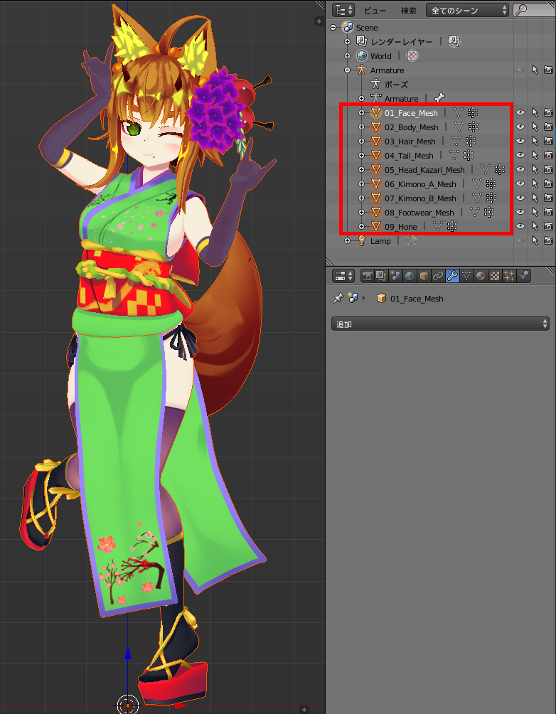 各種シェイプキーが入ってるオブジェクトは上記の手順でポージングを適用していきます。