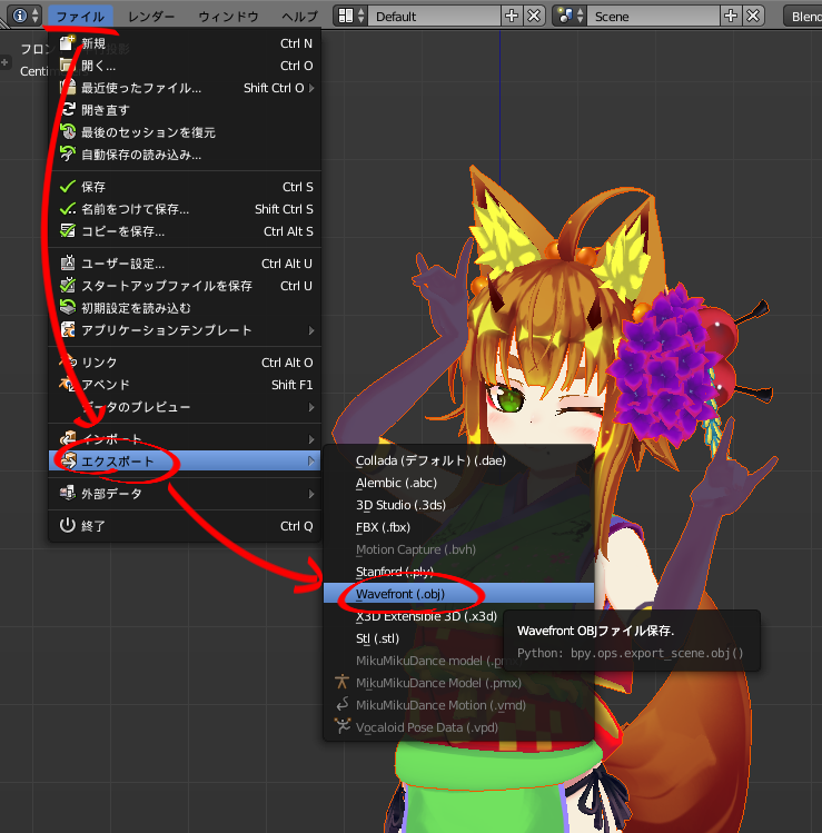 選択後、ファイルメニューから”エクスポート”→”Wavefront(.obj)”を選択しエクスポートします。(出力設定は初期のまま行いました)