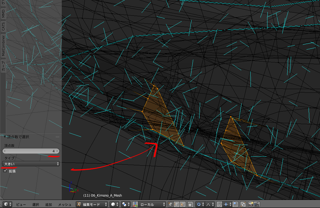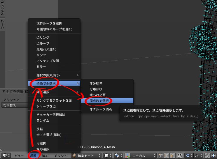 Blender上で編集モードに入り、選択メニューから”特徴で全選択”→”頂点数で選択”をクリック
