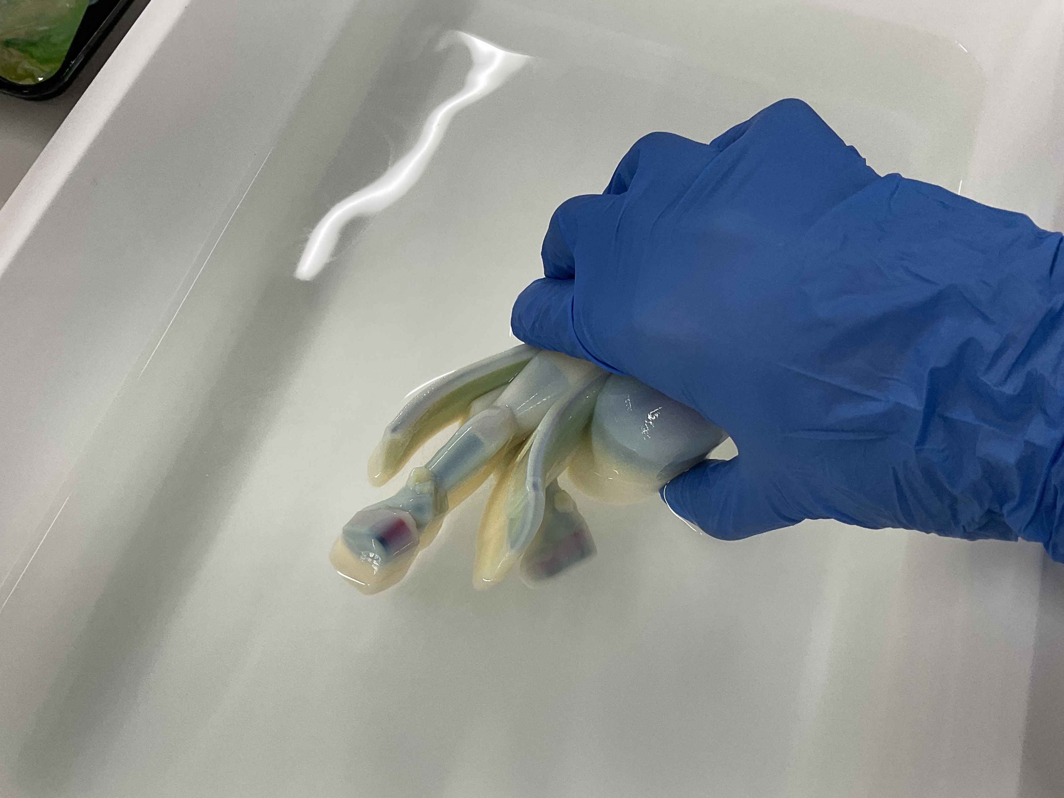 このサポート材の除去方法なのですが、今回造形時に使用したサポート材は水溶性の物のため、水に浸すことにより溶解させることが可能だそうです。
