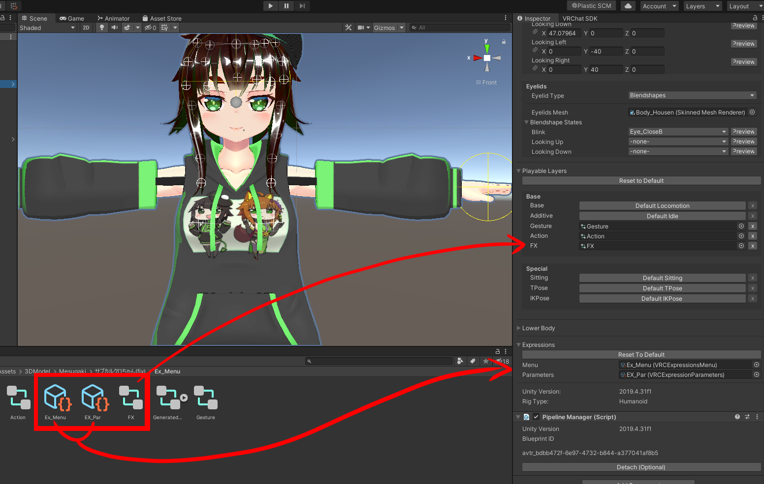 以上3つのファイルを作成したら、アバターの”VRC Avatar Descriptor”の”Platable Layers”と”Expressions”に割り当てます。