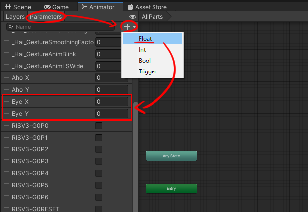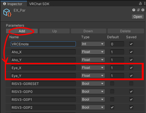その中からParametersの”Add”をクリックし画像赤枠のように”Eye_X”,”Eye_Y”をFloatで作成しましょう。