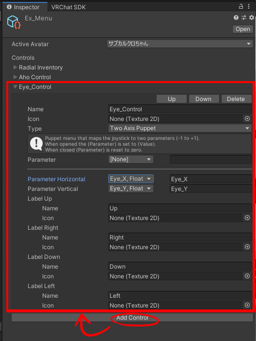 Inspector内で”Ass Control”を押しCOntrol内容を追加しましょう。