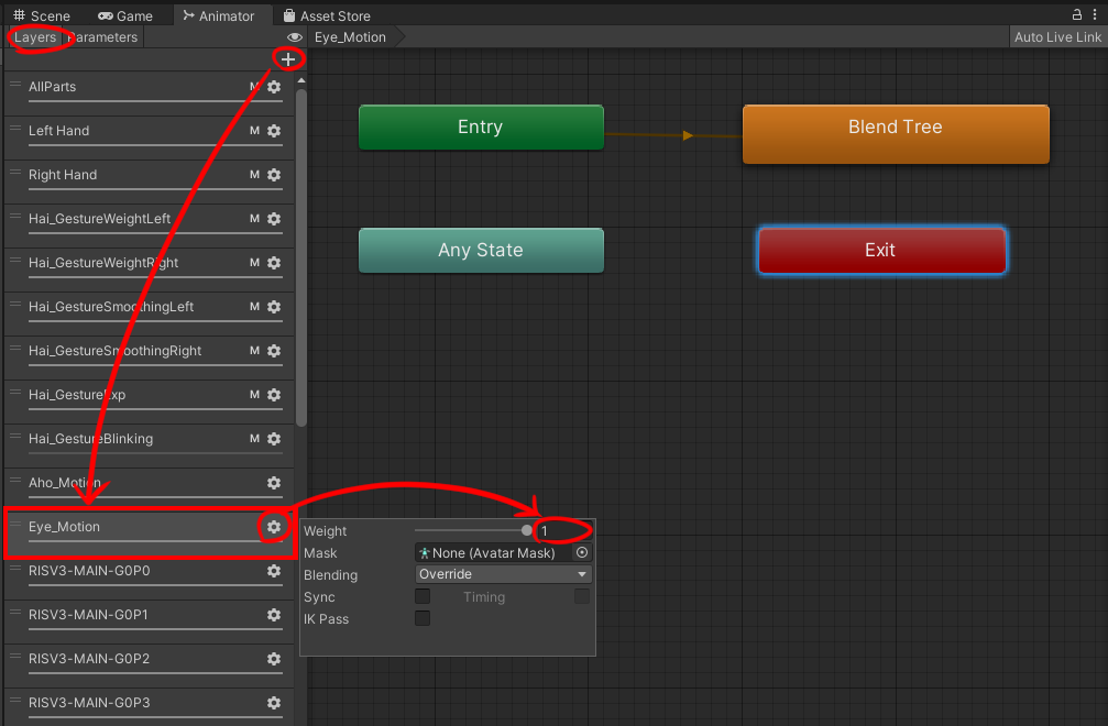 Animator内タブを”Layers”に戻してリスト上の”+”を押して”Eye_Motion”を作成します。