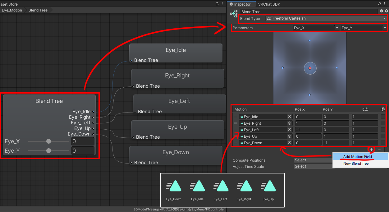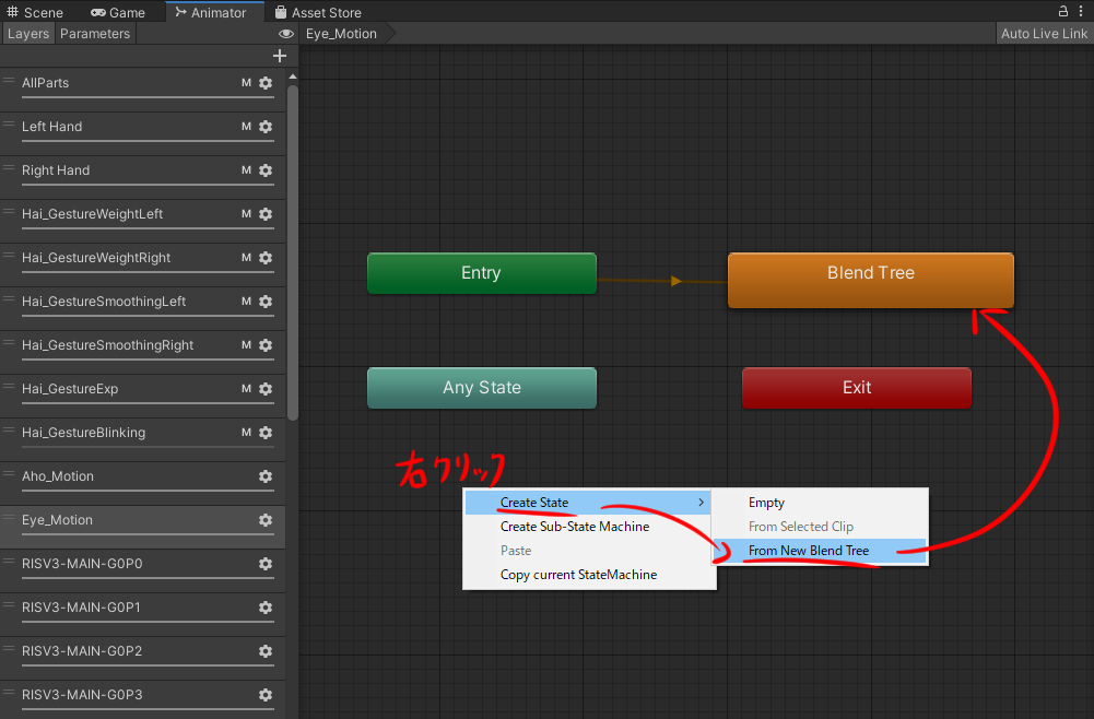 次にEye_Motion内のどこかで右クリックし、”Create”→”From New Blend Tree”を選択しBlend Treeを作成する。