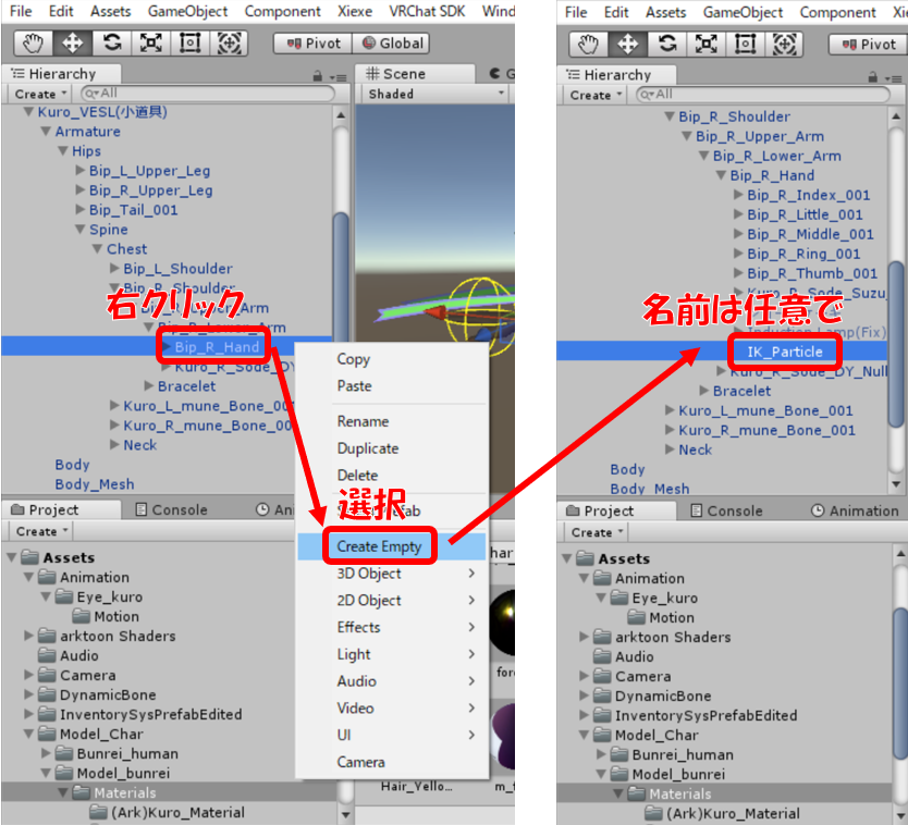 アバターモデルの右手のボーンで右クリック→「Create Empty」を選択する。