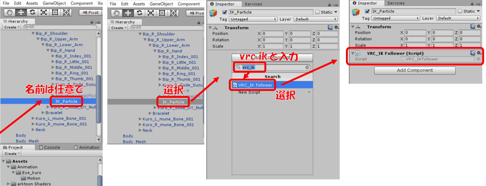 さきほど作成したフォルダ”IK_Particle”を選択しInspector内から”Add Conponent”を押す。