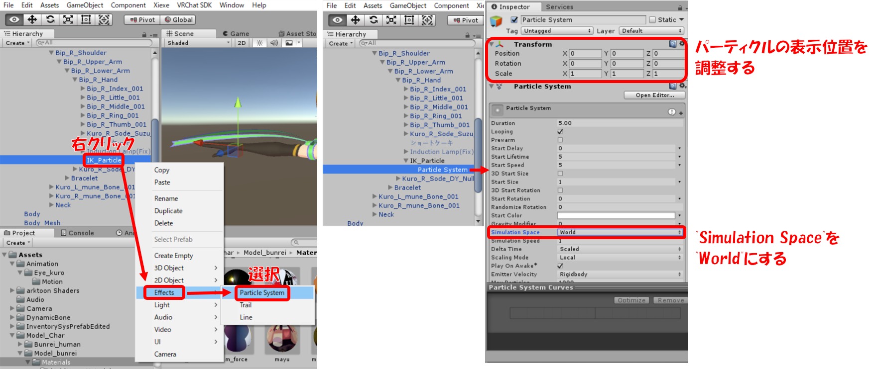 では今回はくろちゃん(分霊)モデルの右手にワールドパーティクルを設定していきます。