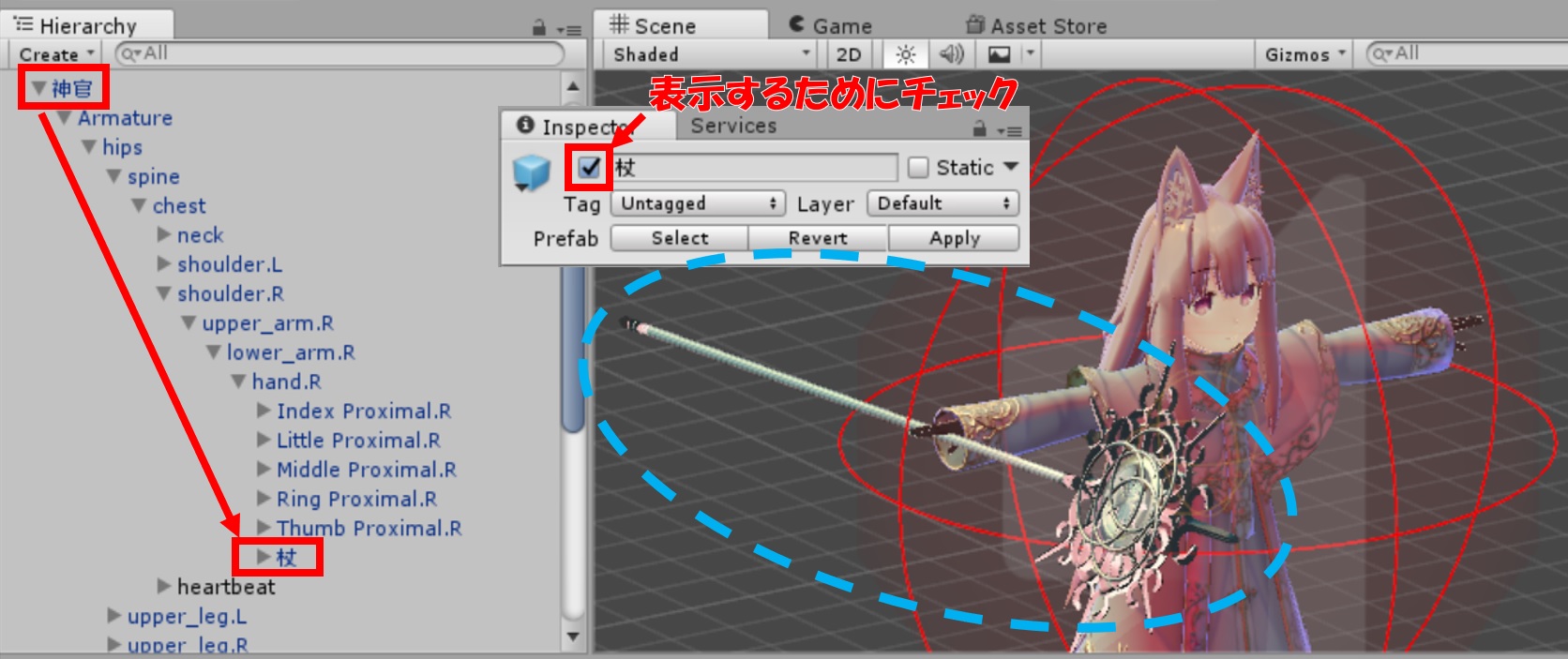 クレリックちゃんは標準で右手に杖を持っています。(普段は非表示ですが、今は設定しやすいように表示しております。)