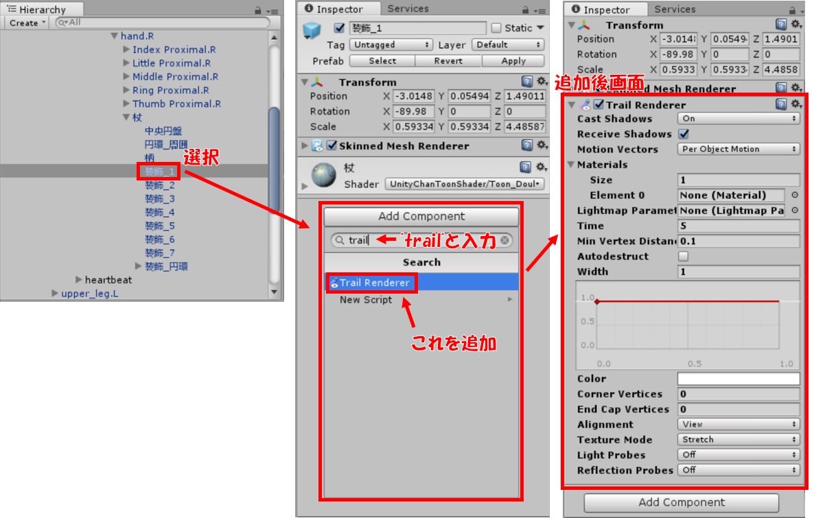 杖の先端部(装飾_1)を選択後、Unity画面右側のInspectorからAdd Component