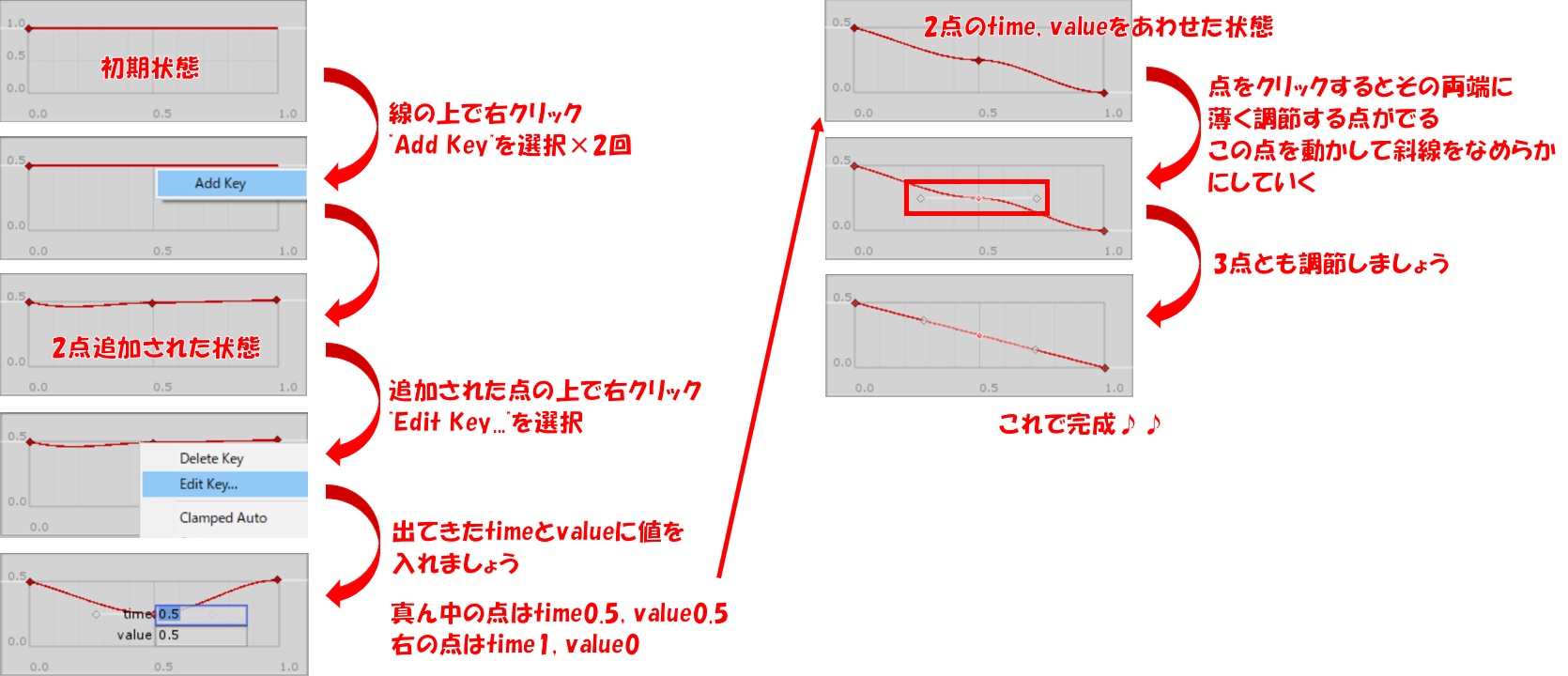 真ん中の点はtime0.5, value0.5、左の点はtime1, value0を入れる