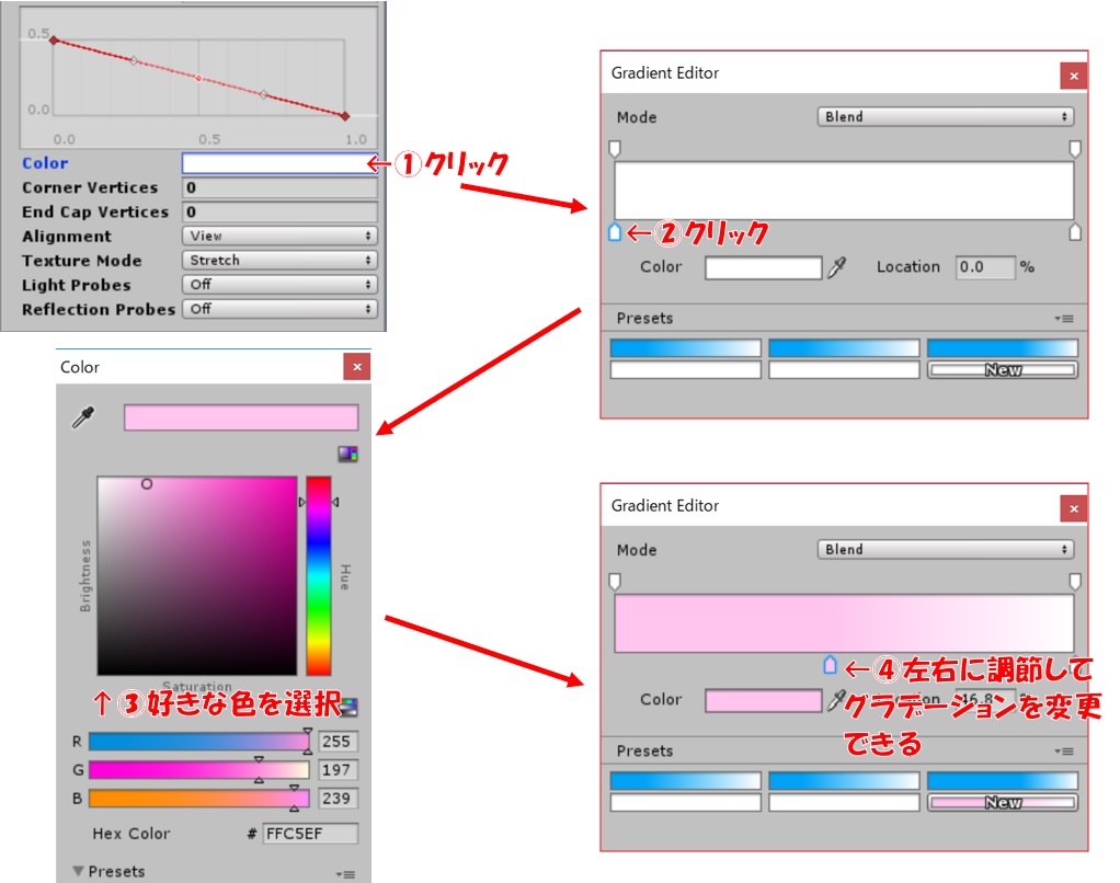 ①Inspector内Trail Renderer → Colorをクリック