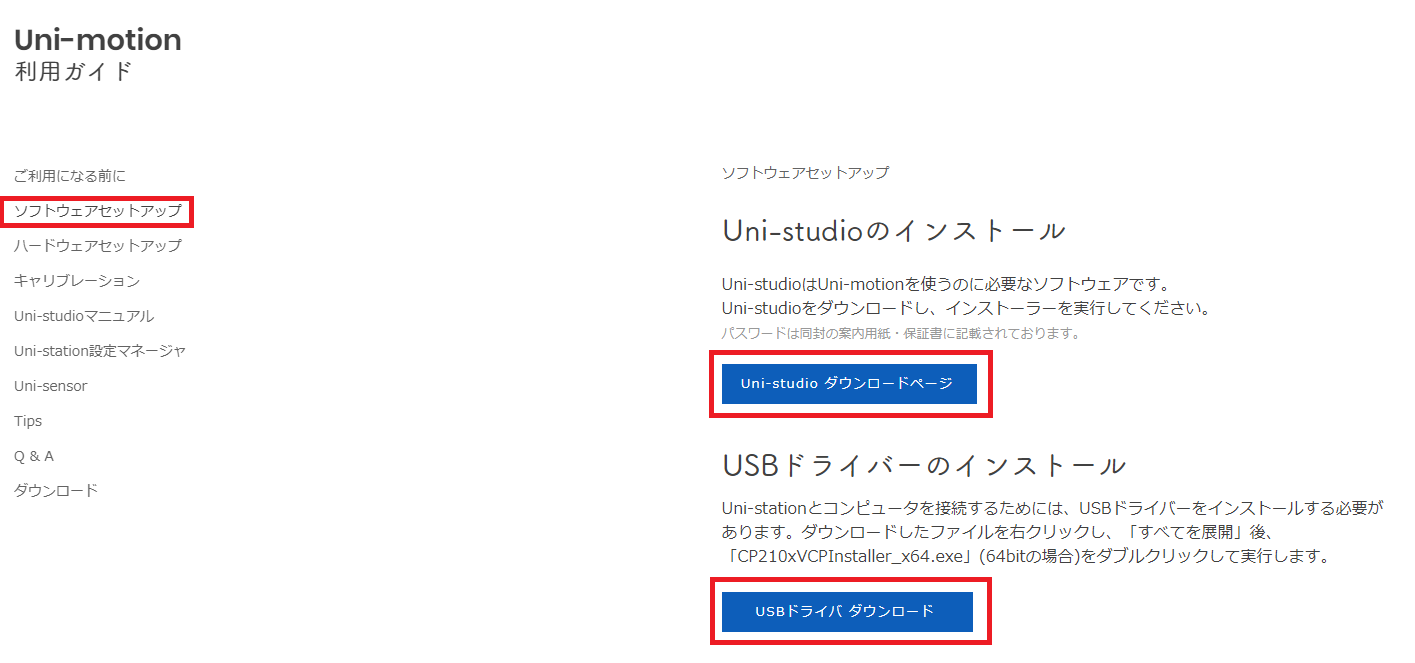 利用ガイドの”ソフトウェアセットアップ”ページに行き、”Uni-mstudio”と”USBドライバー”をダウンロードしてきましょう。
