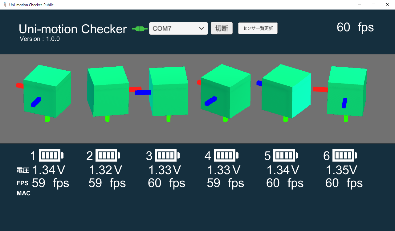 Checkerを起動するとこのようにセンサーが認識されUni-sensorを動かすと対応したキューブが動いてくれます。