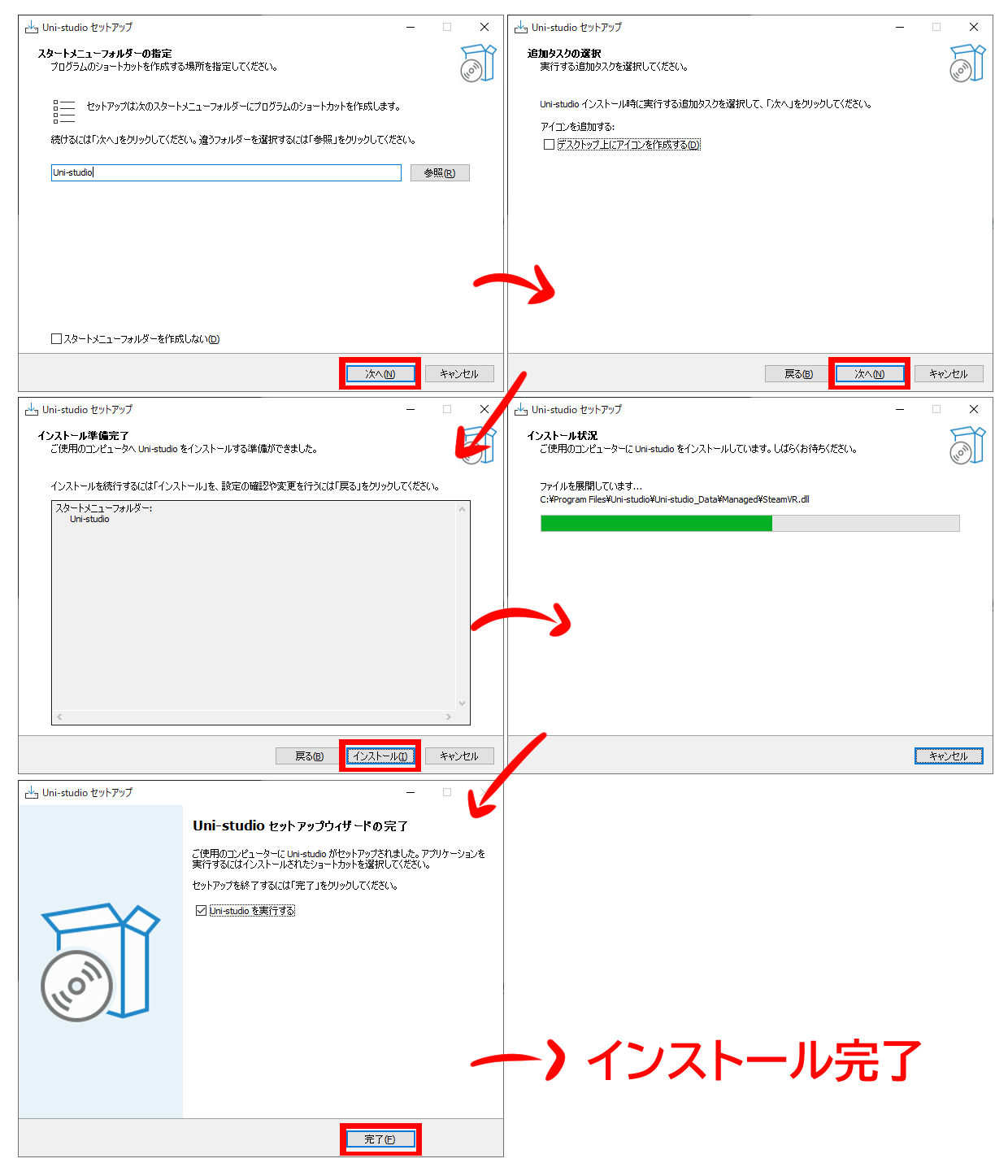ダウンロード・解凍したUni-studio内にある実行ファイルをダブルクリックしインストールをしていきましょう。