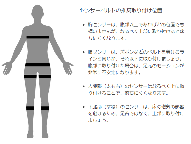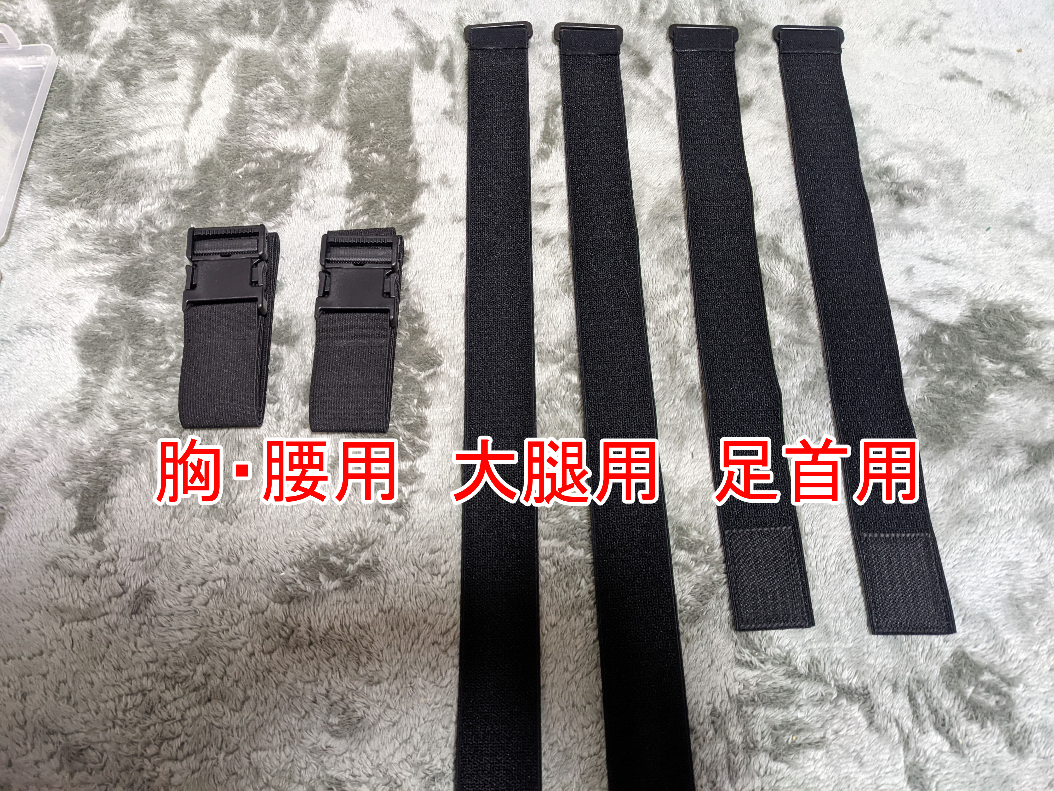 胸・腰に関してはバックルをはめるだけなのでとても手軽にでき、足のトラッカーもゴムバンド&マジックテープで巻きつけるだけなので手軽にできる方だと思います。