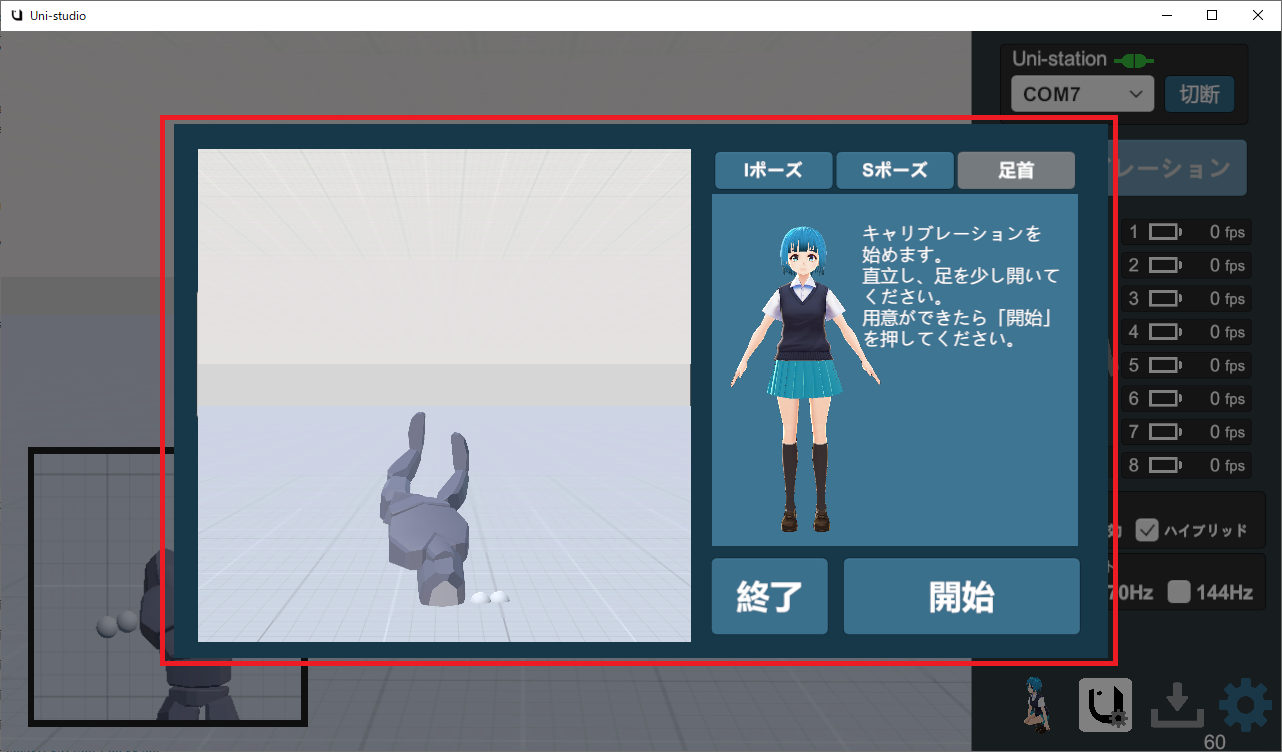 キャリブレーション画面が出てくるので右側のモデルを同じ姿勢を取り”開始”を押す。